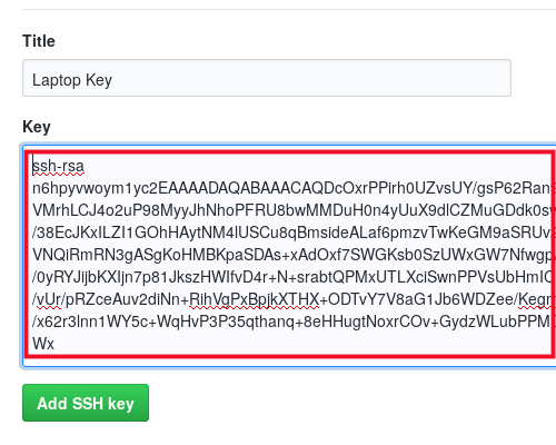 - Enter a title for the Title field and paste the SSH Key obtained in step 1 into the Key field