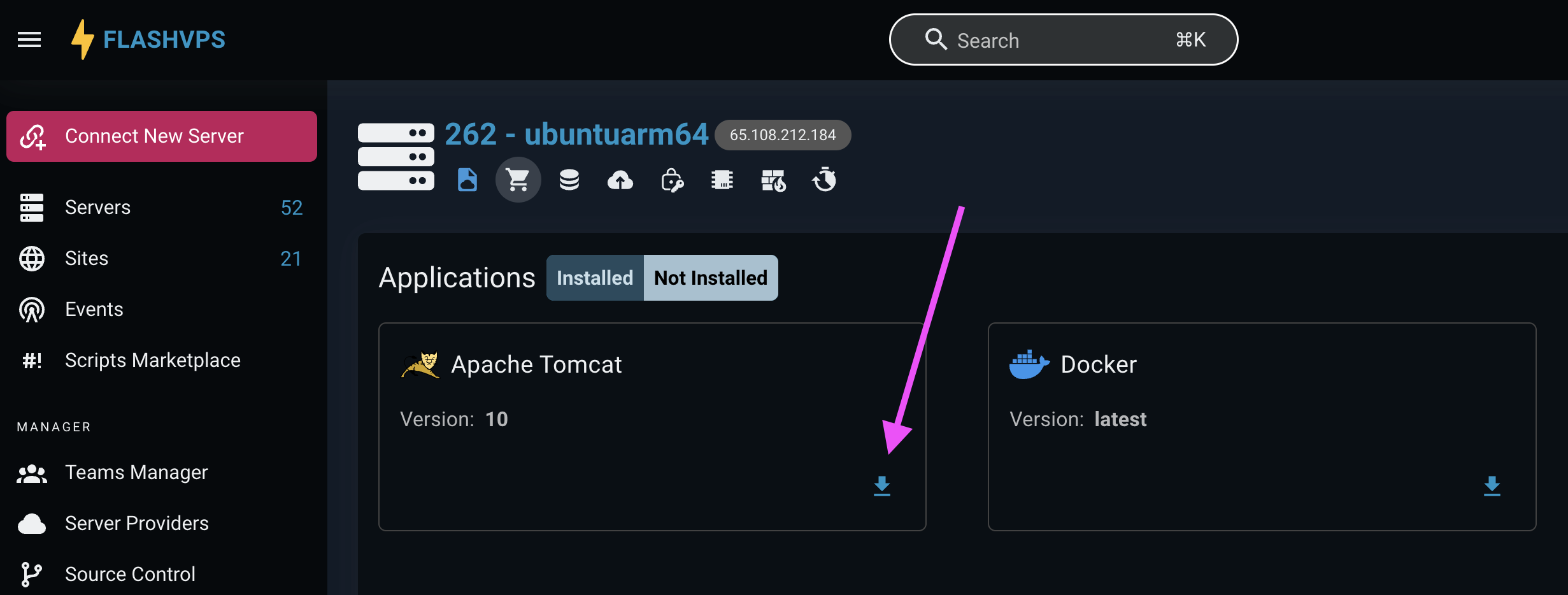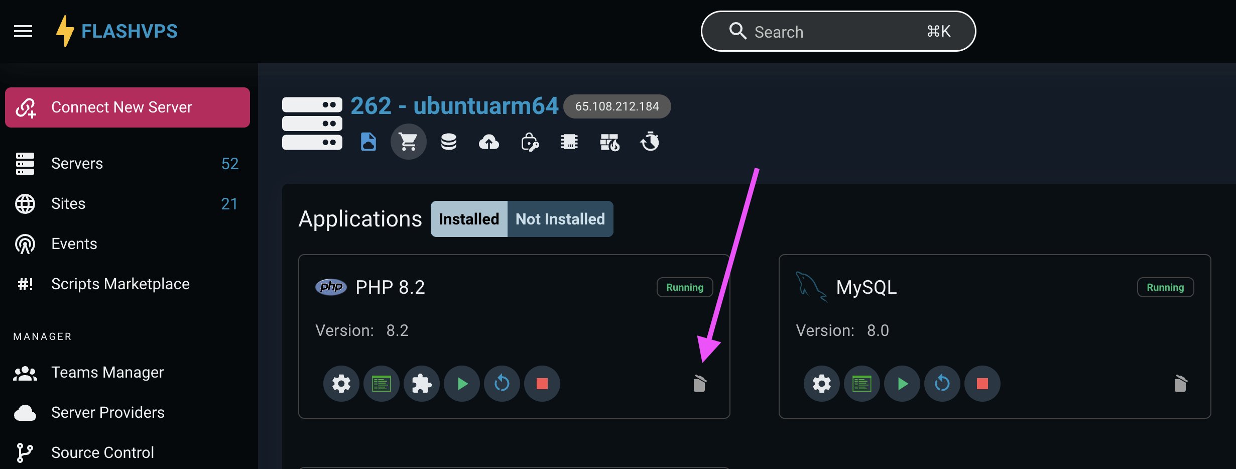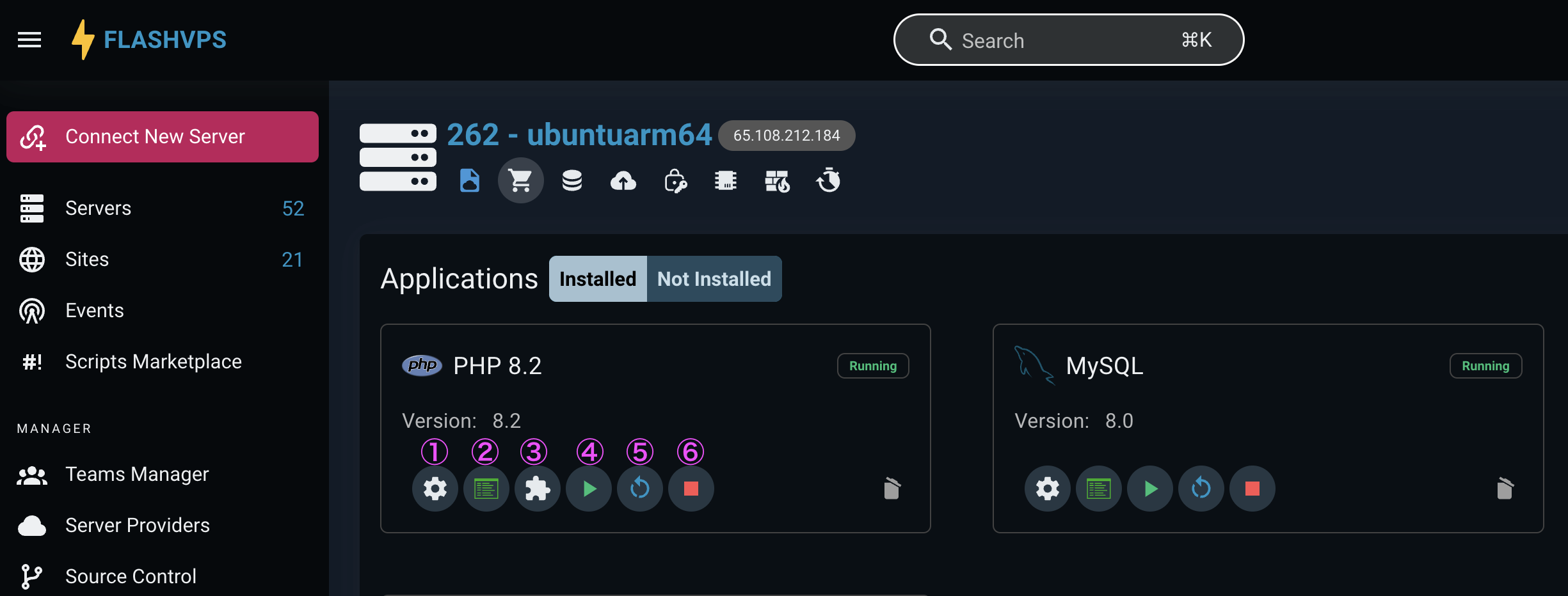 The application is the place to store and manage server applications, where you can install, remove, or pause any application for the server. Currently FlashPanel is supporting the installation of many applications, including: