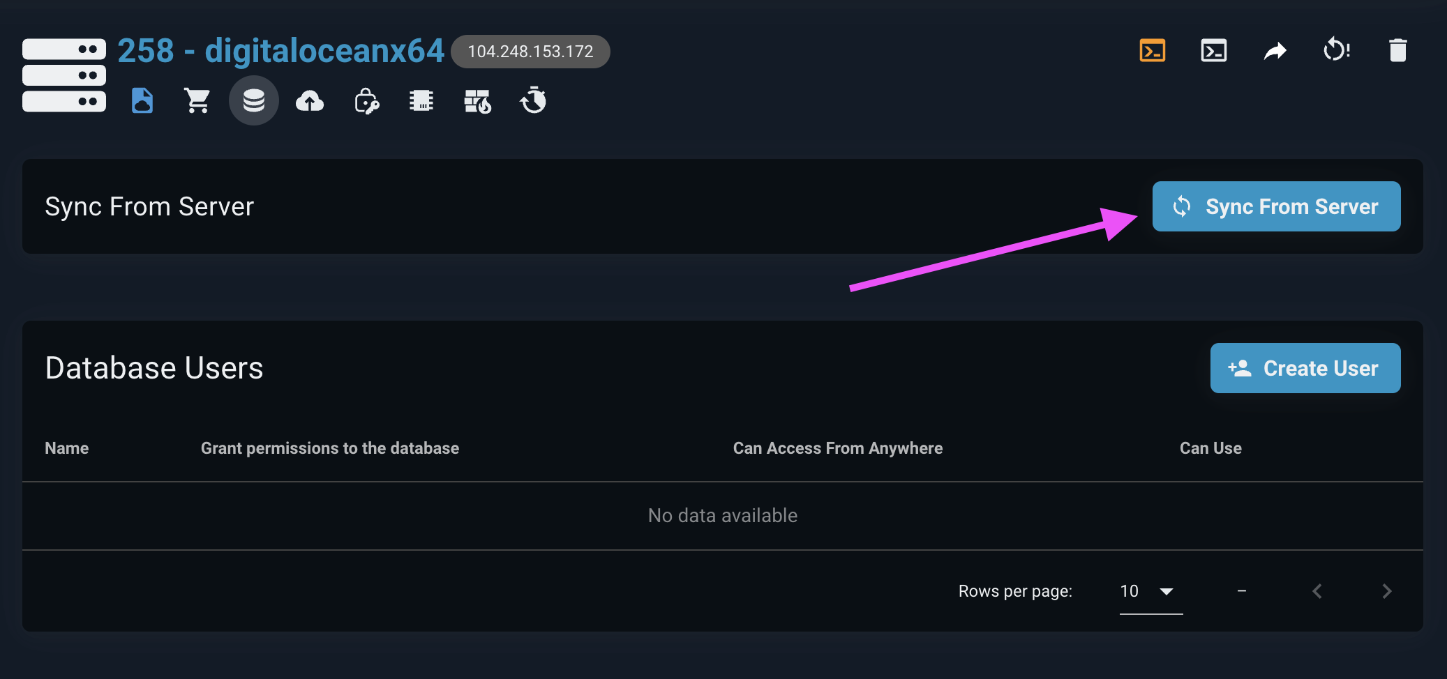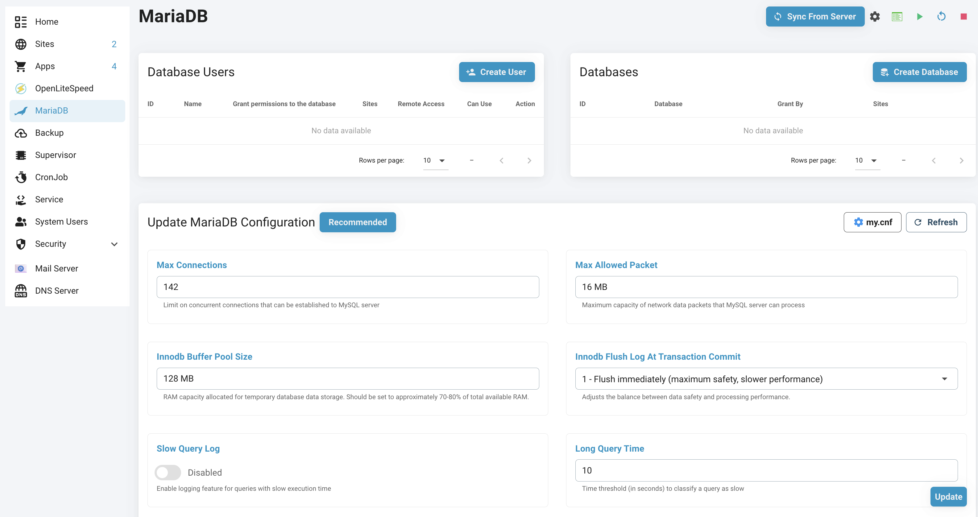 In FlashPanel, the database sync feature allows users to easily synchronize the names of databases and database usernames on the server. This way, the administrator can ensure that all database information on the server is synchronized so that it can be operated on the panel.