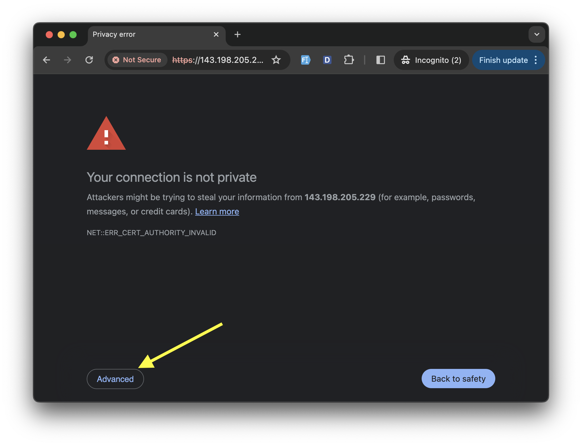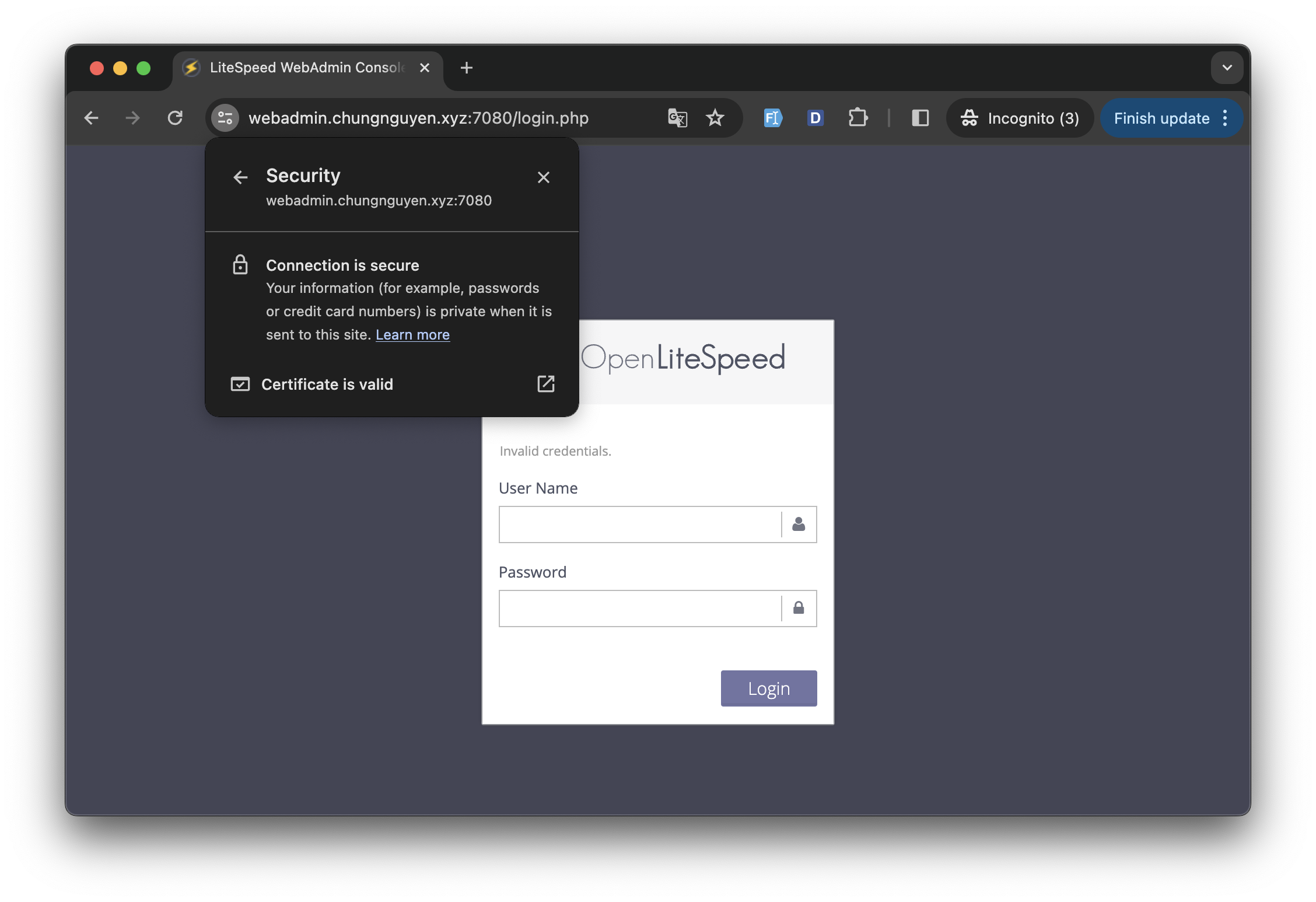 After installing OpenLiteSpeed, you can access OpenLiteSpeed Web Admin: https://ip:port. When accessing the admin website for the first time you will encounter the security warning Your connection is not private NET::ERR_CERT_AUTHORITY_INVALID. This warning is not serious, because by default the OpenLiteSpeed web admin uses a self-signed certificate on the server.