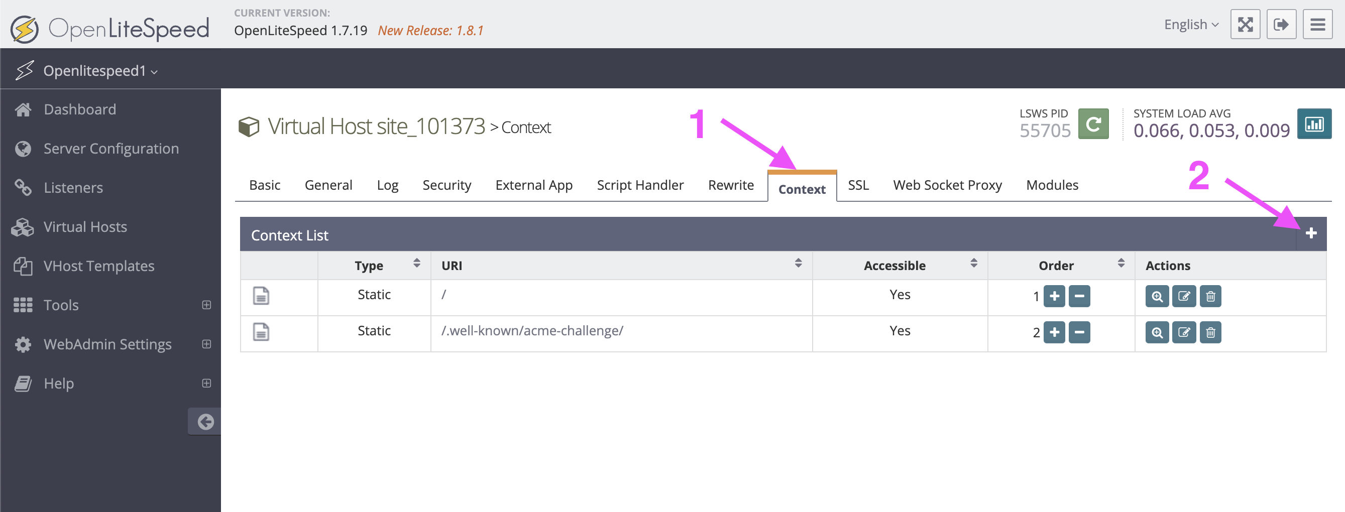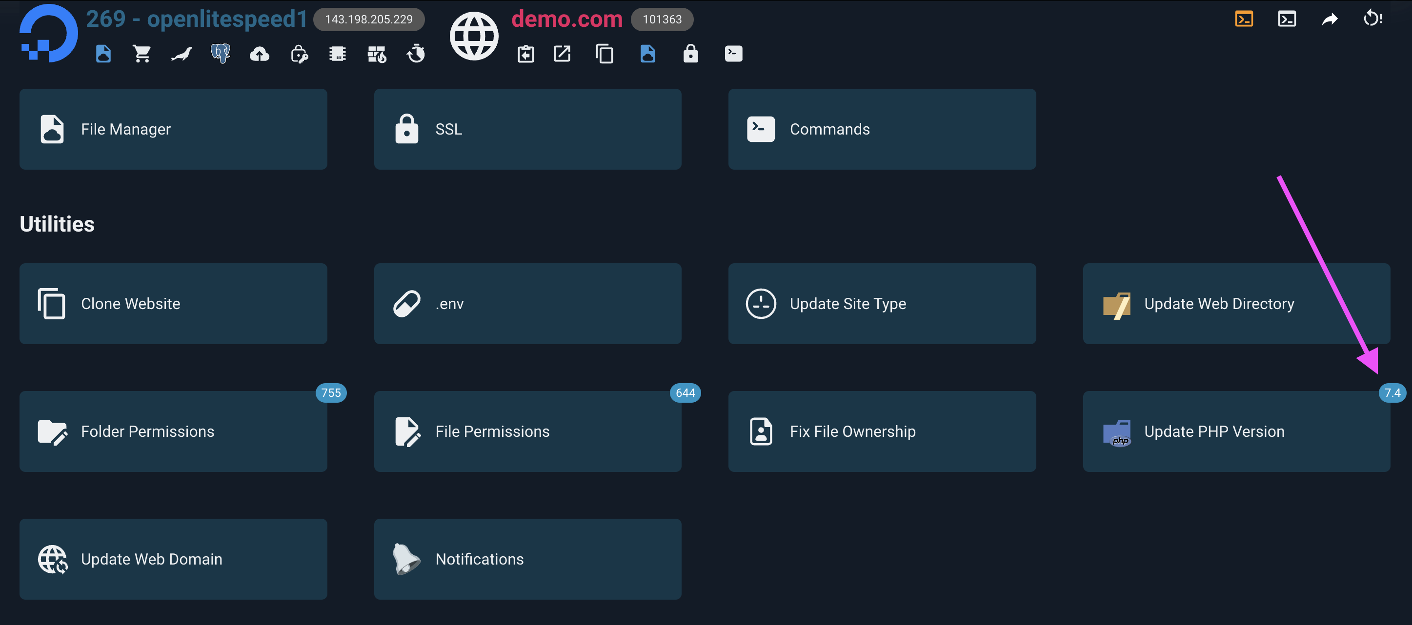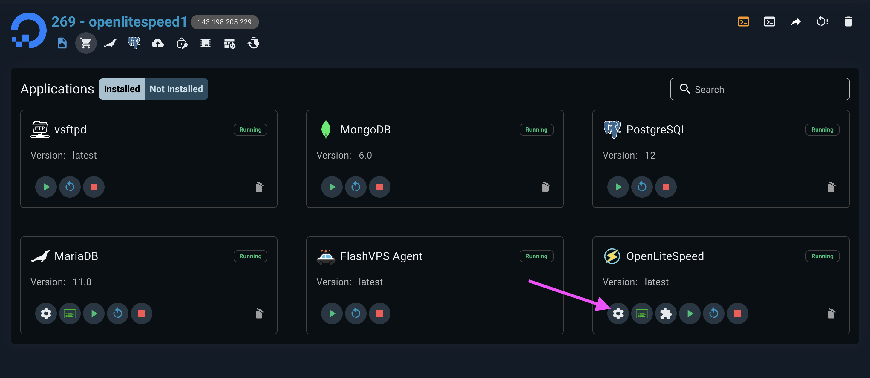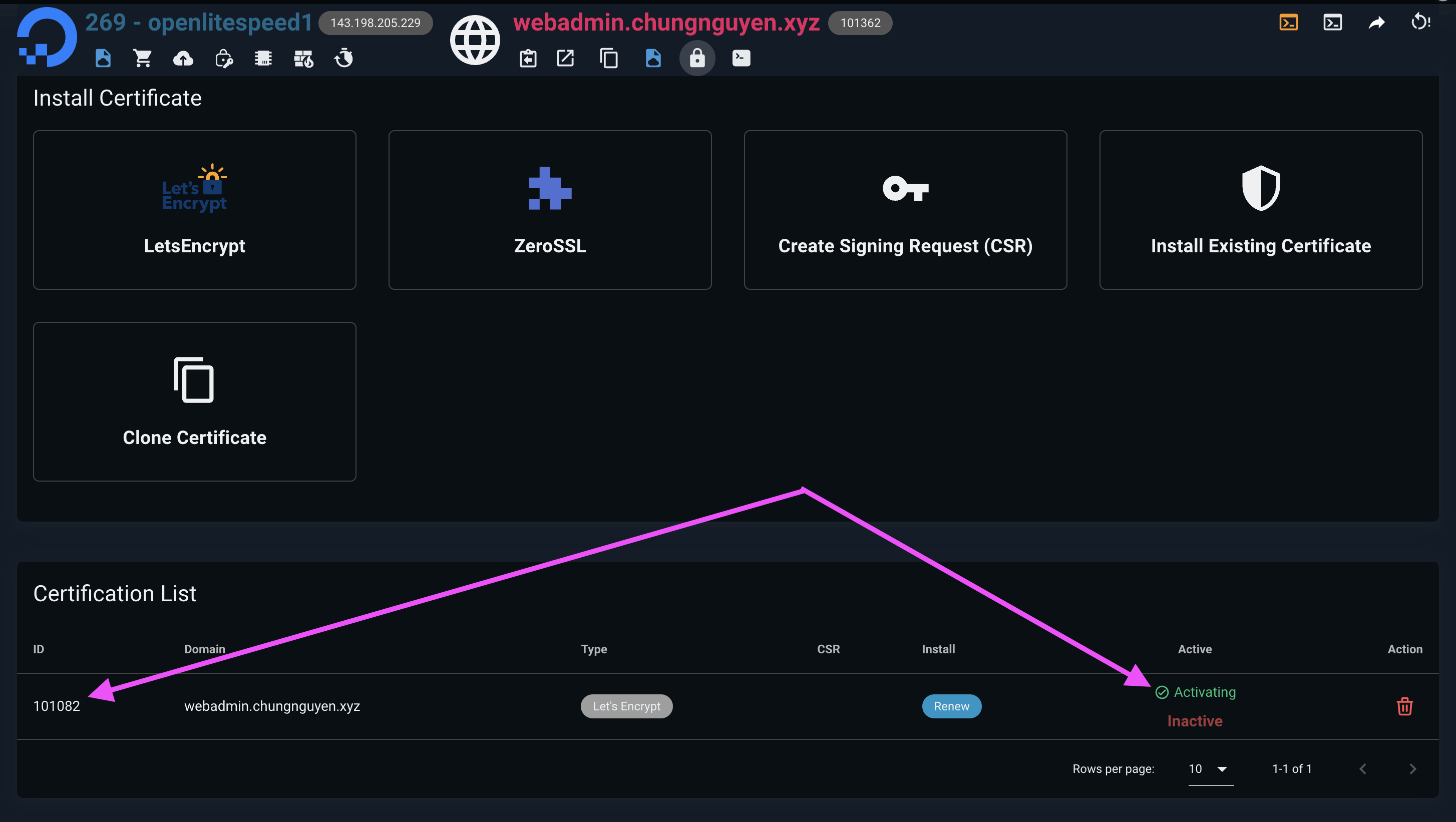 bash# change 101082 to the id corresponding to the website's SSL ID # sed -i 's/admin\/conf\/webadmin/conf\/cert\/101082\/server/' /usr/local/lsws/admin/conf/admin_config.conf sudo /usr/local/lsws/bin/lshttpd -t sudo systemctl restart lswsAccess web admin using domain:port (default 7080)