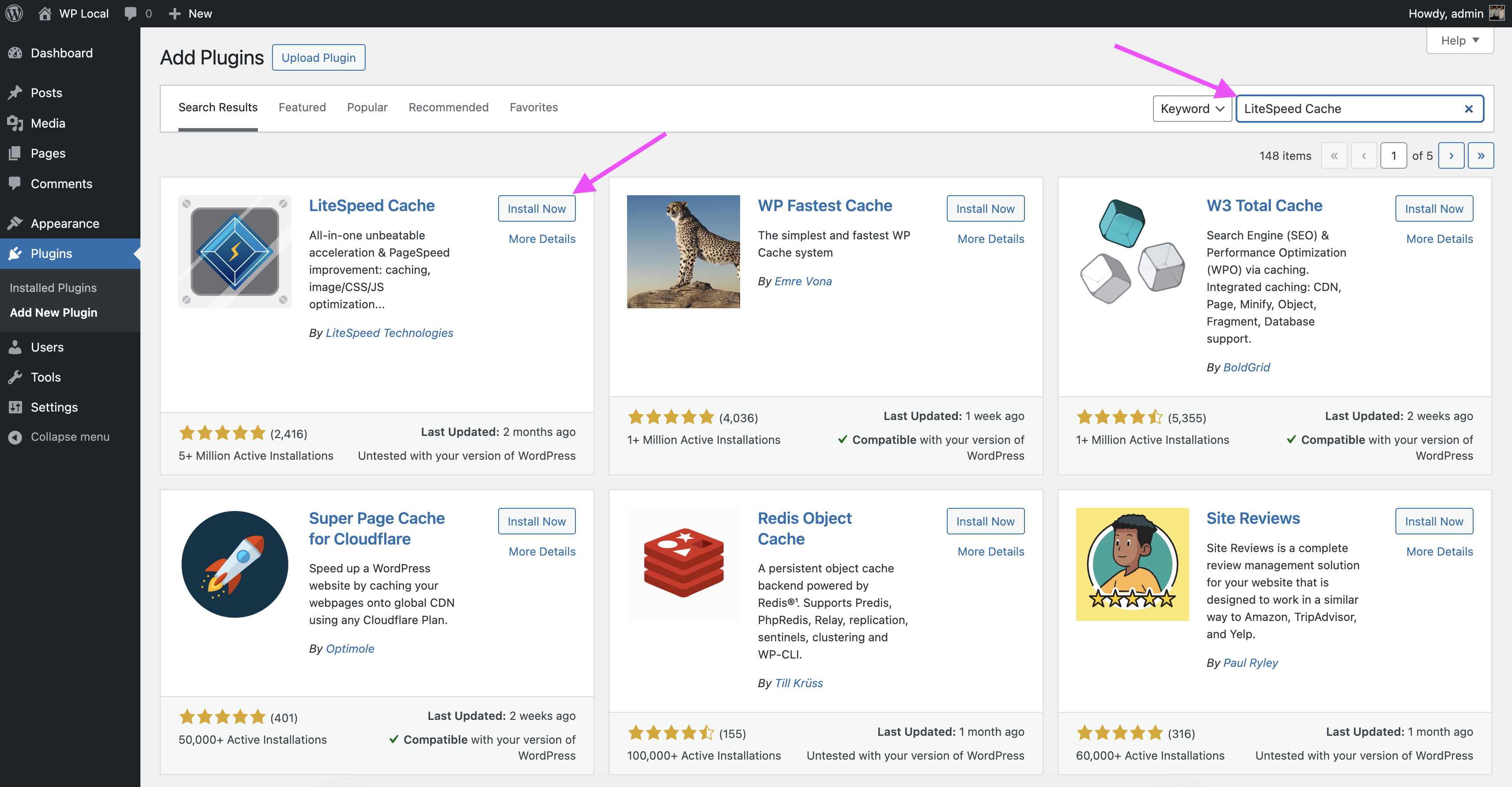 LiteSpeed Cachein the search box. Click Install Now and Activate the plugin.