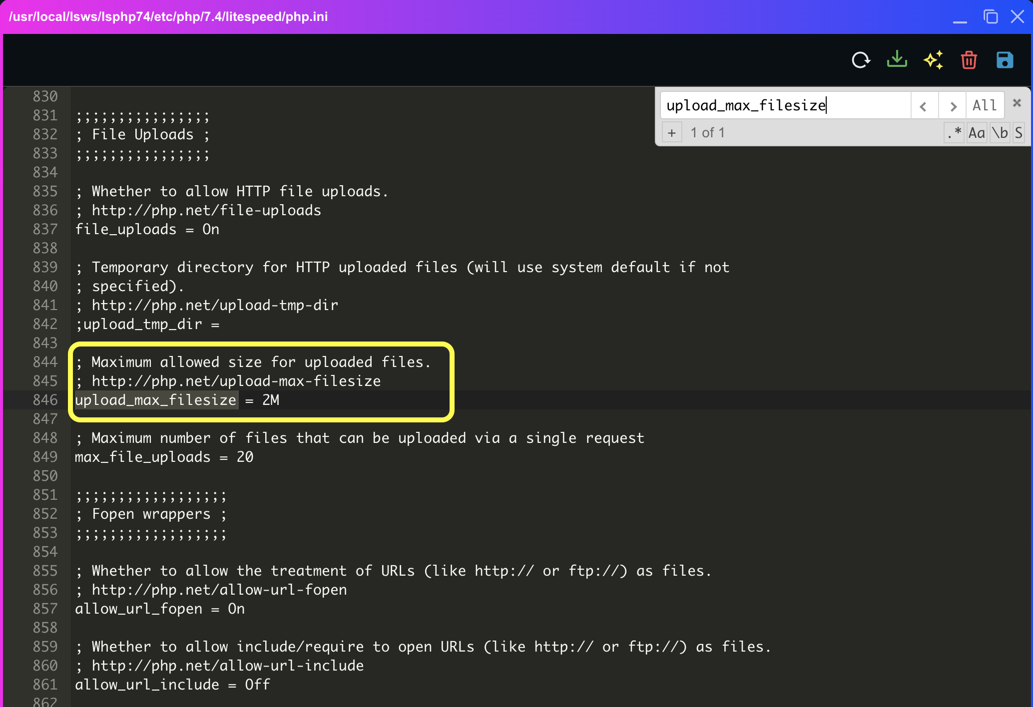 upload_max_filesizesetting value in thephp.inifile. The default is2M, which is 2 megabytes, and change it to the value you desire