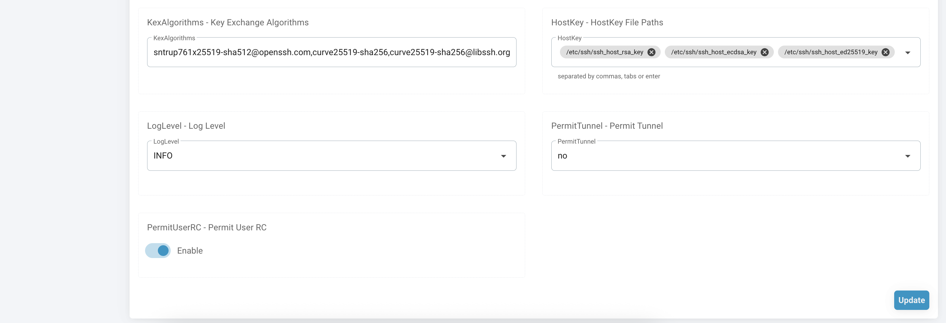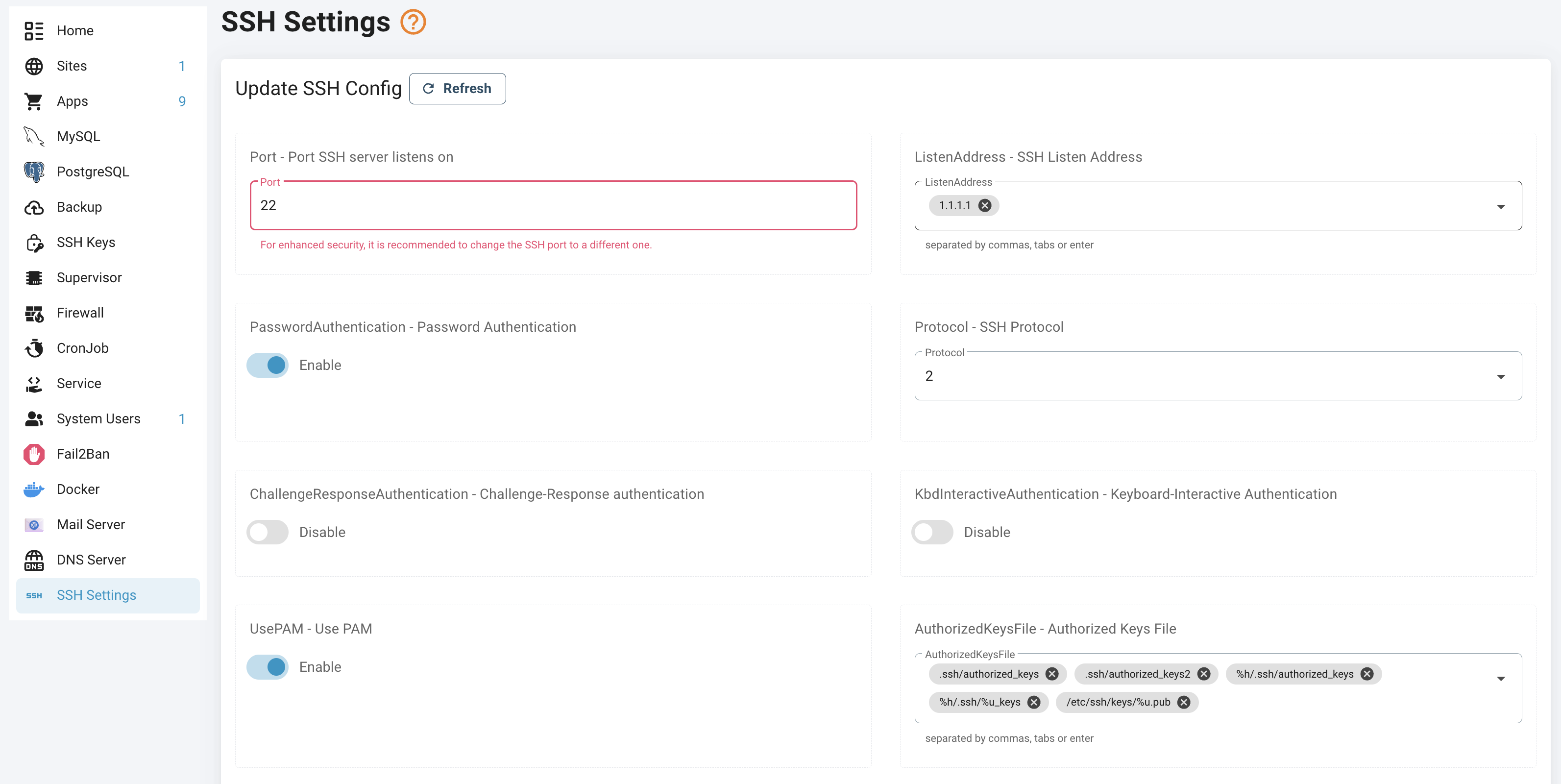 This feature lets you update important SSH server settings (in sshd_config) directly through the web , without SSH access or editing files manually.