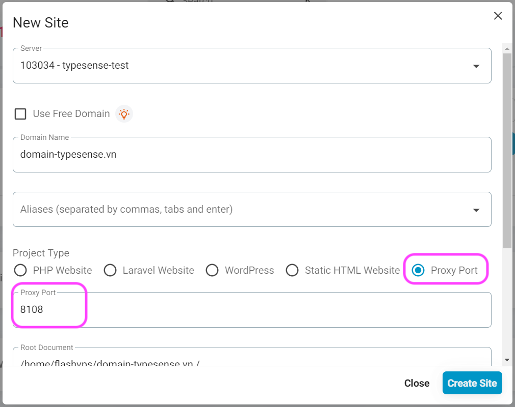 Remember to fill in the necessary information: Domain (or subdomain is fine, and remember to point DNS to the server IP), select type Proxy Port, and enter Proxy port 8108, as shown below. And click create site.