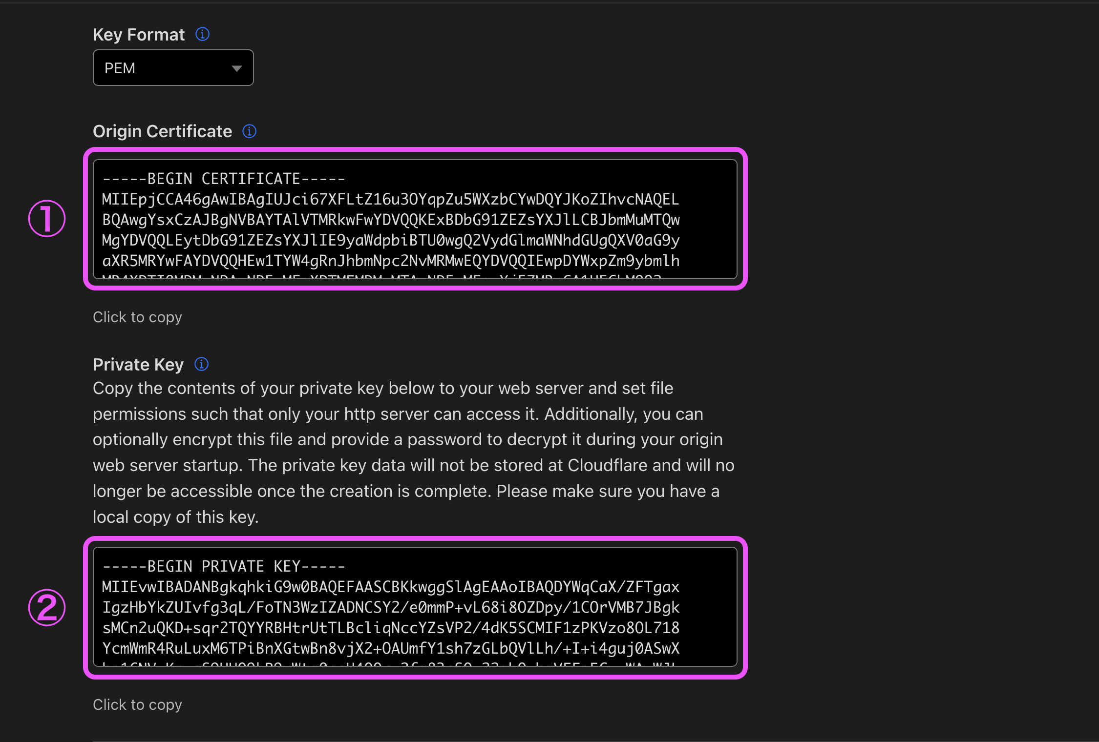 - Paste the certificate code and Certificate field and the private key code into the Private Key field