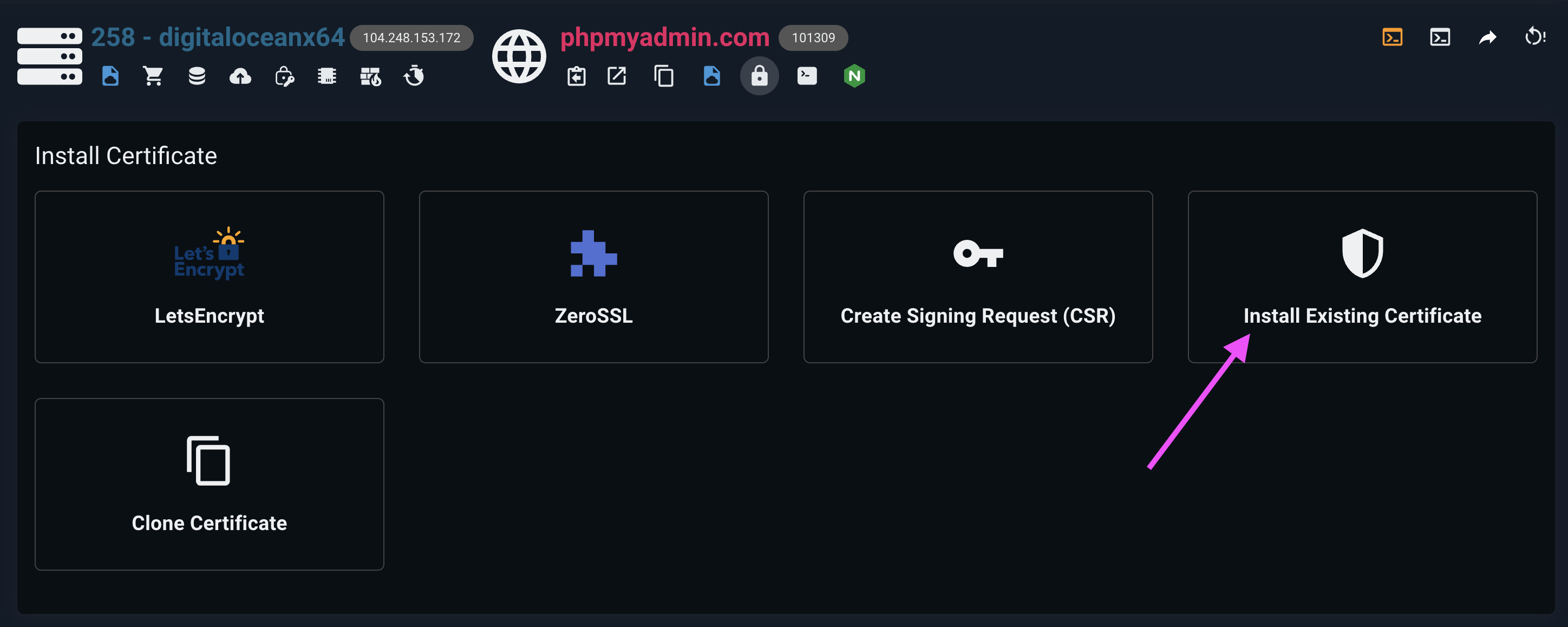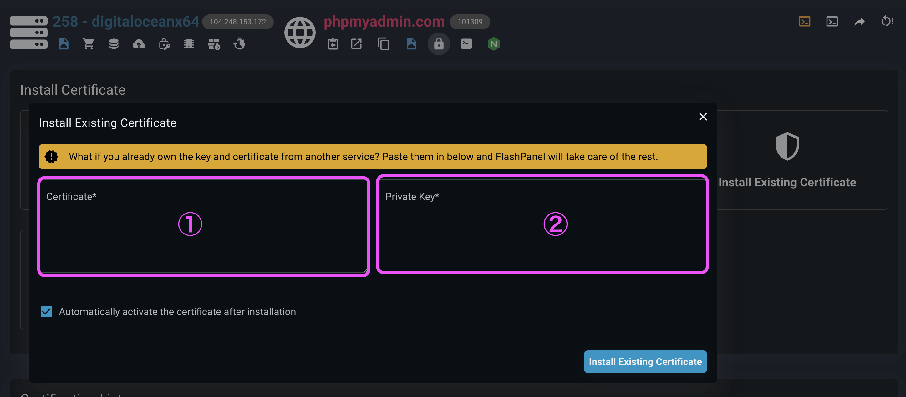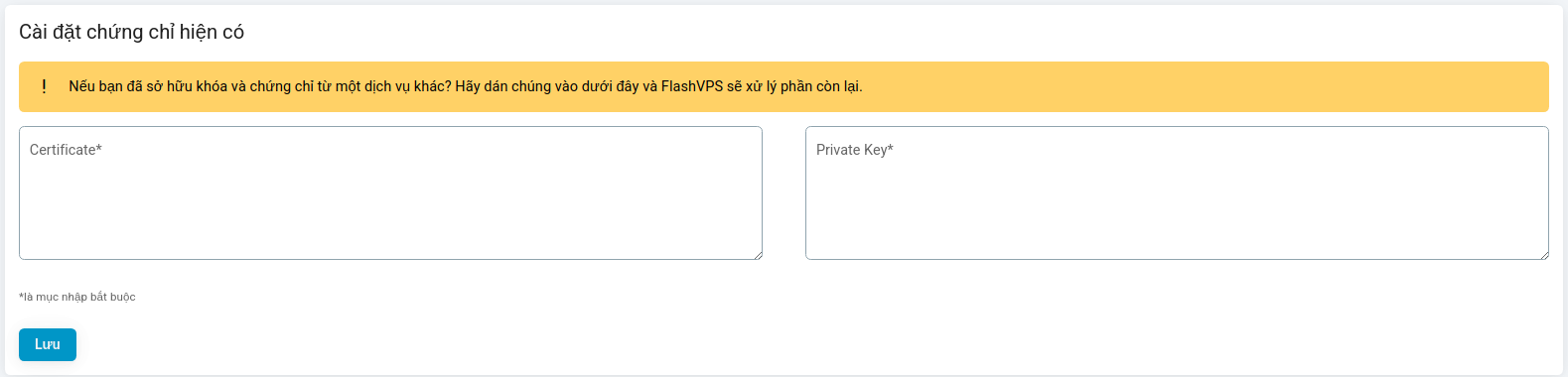 If you already own a key and certificate from another service. FlashPanel helps you install that certificate for your website.