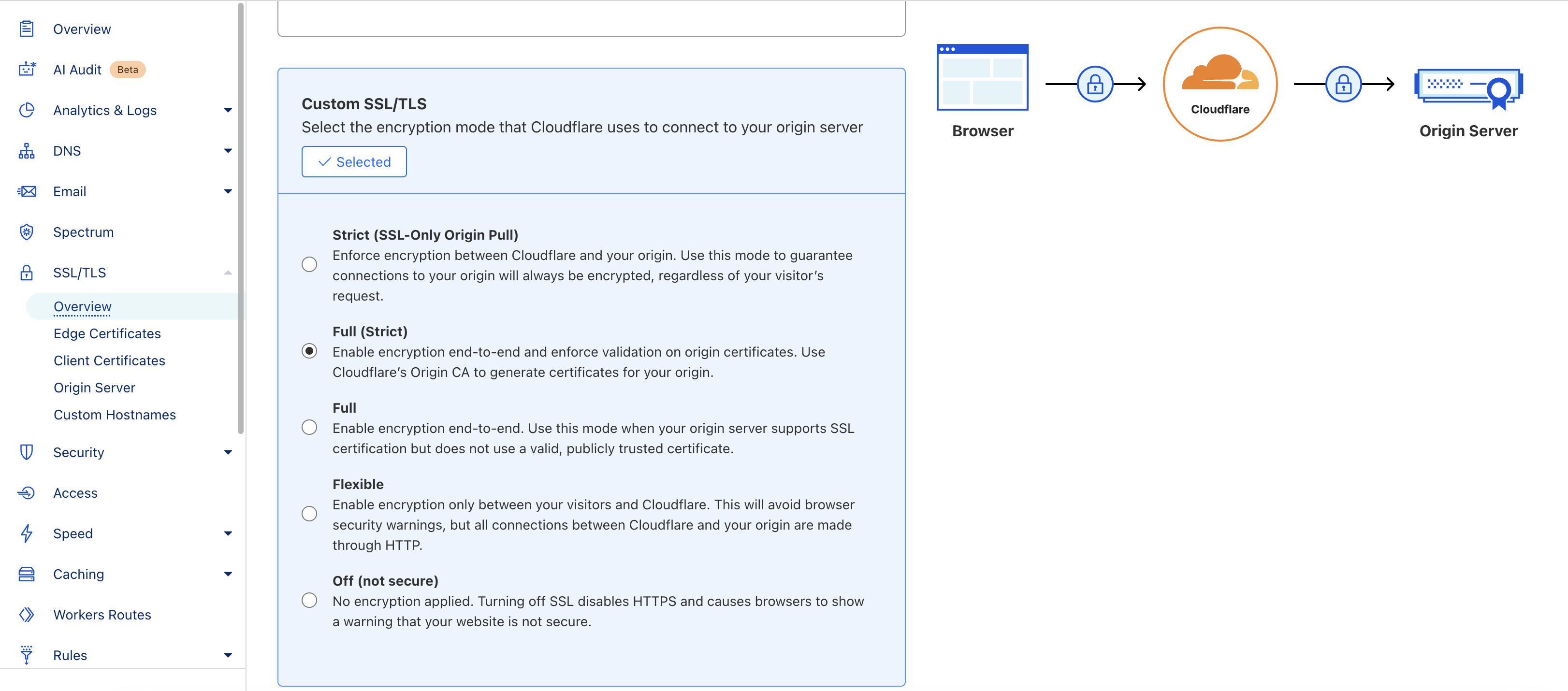 Cloudflarepanel, then selectSSL/TLS. Here selectSSL/TLS encryption modetoFull