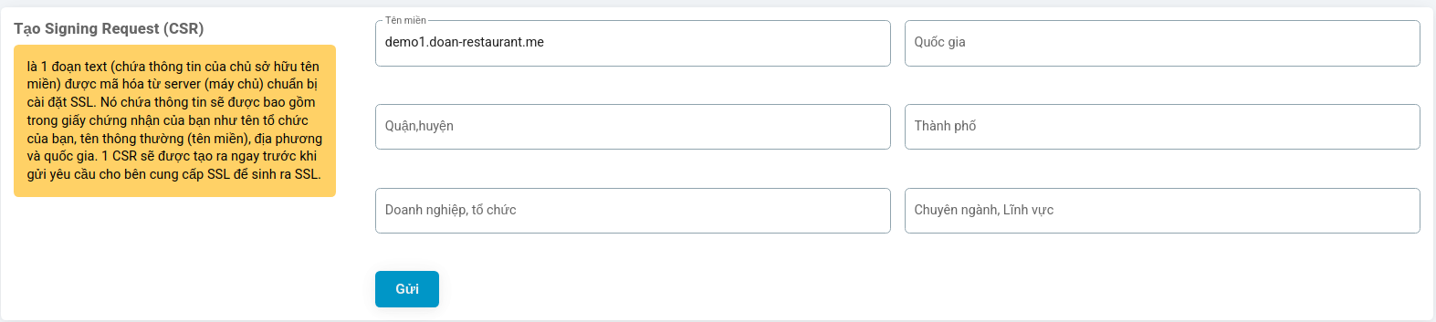Create Signing Request is a piece of text (containing information of the domain owner) encrypted from the server preparing to install SSL. It contains information that will be included in your certificate such as your organization name, common name (domain name), locality and country. 1 CSR will be created immediately before sending the request to the SSL provider to generate SSL.
