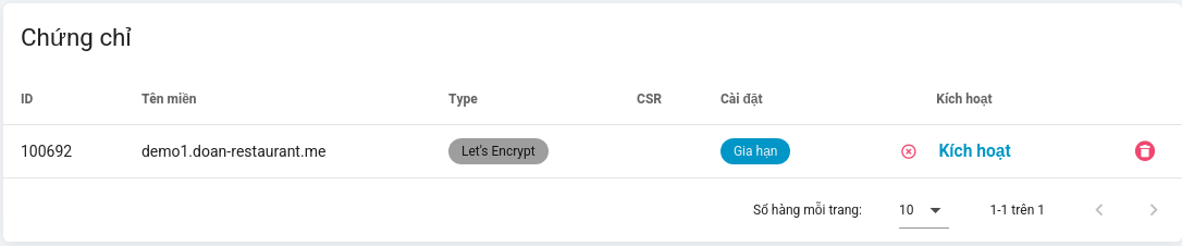 FlashPanel displays the list of installed certificates as a table. Here you can Renew, Activate or delete the certificate for the website.