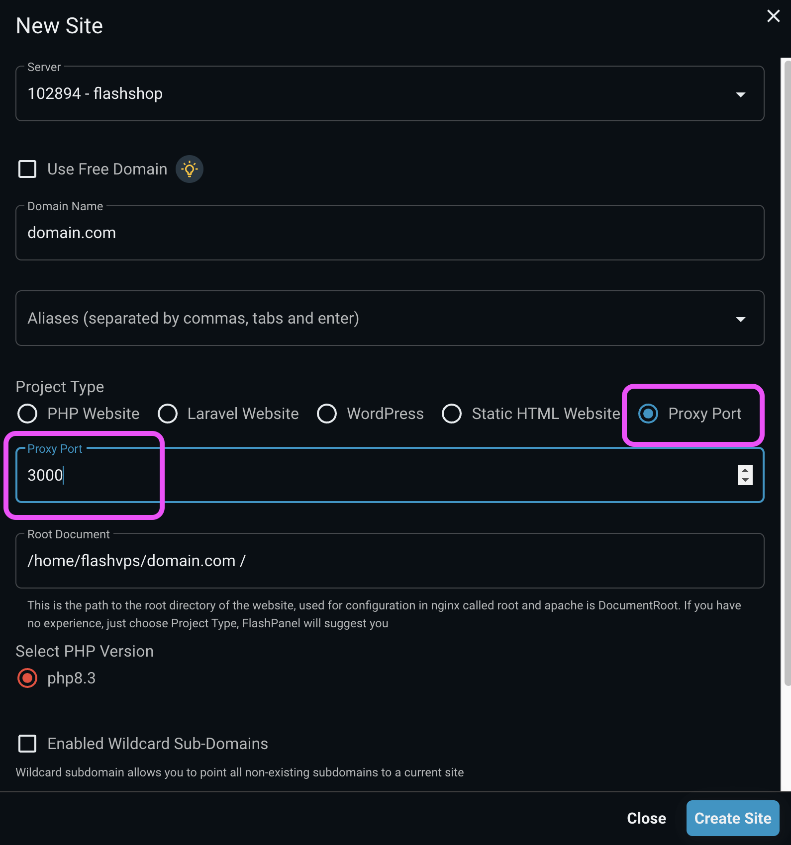 3000to the proxy port you declared when creating the website before - Please change