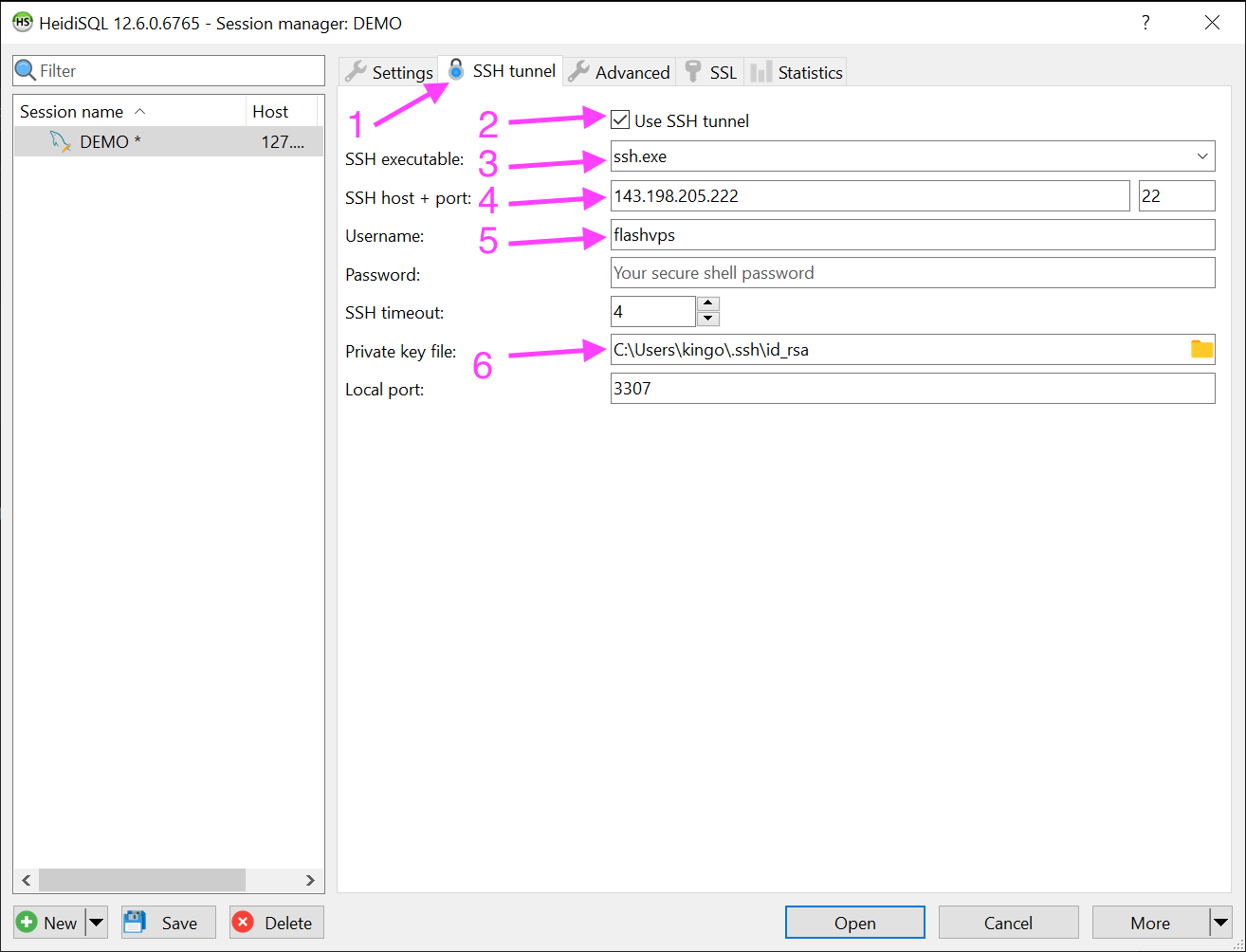 - Private key file: is the key added in step add SSH Key to server note: select private key is PuTTY (.ppk)